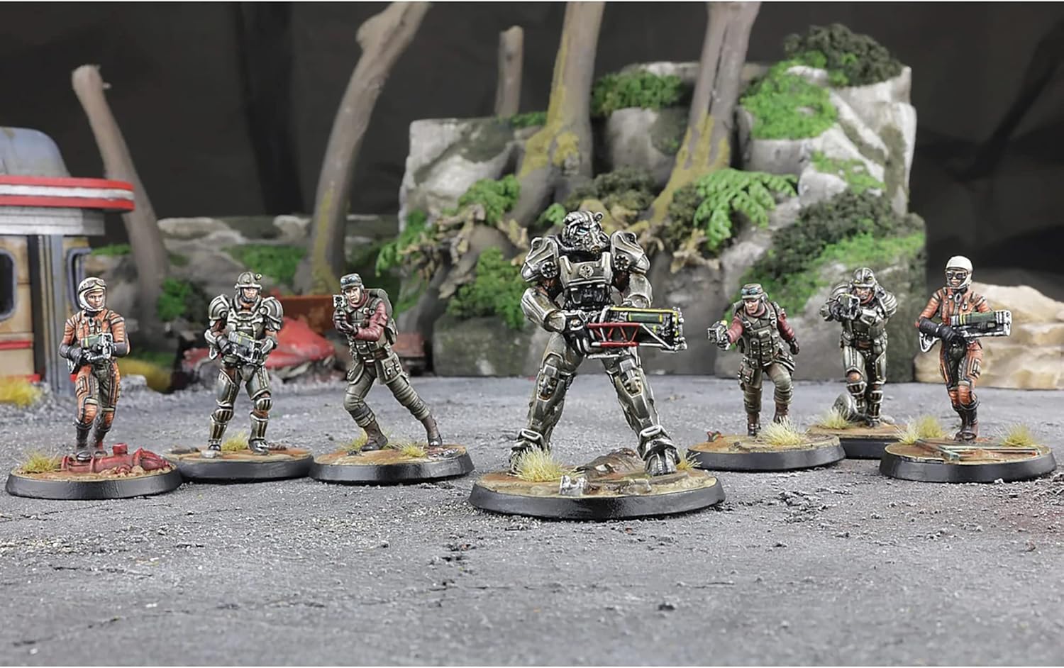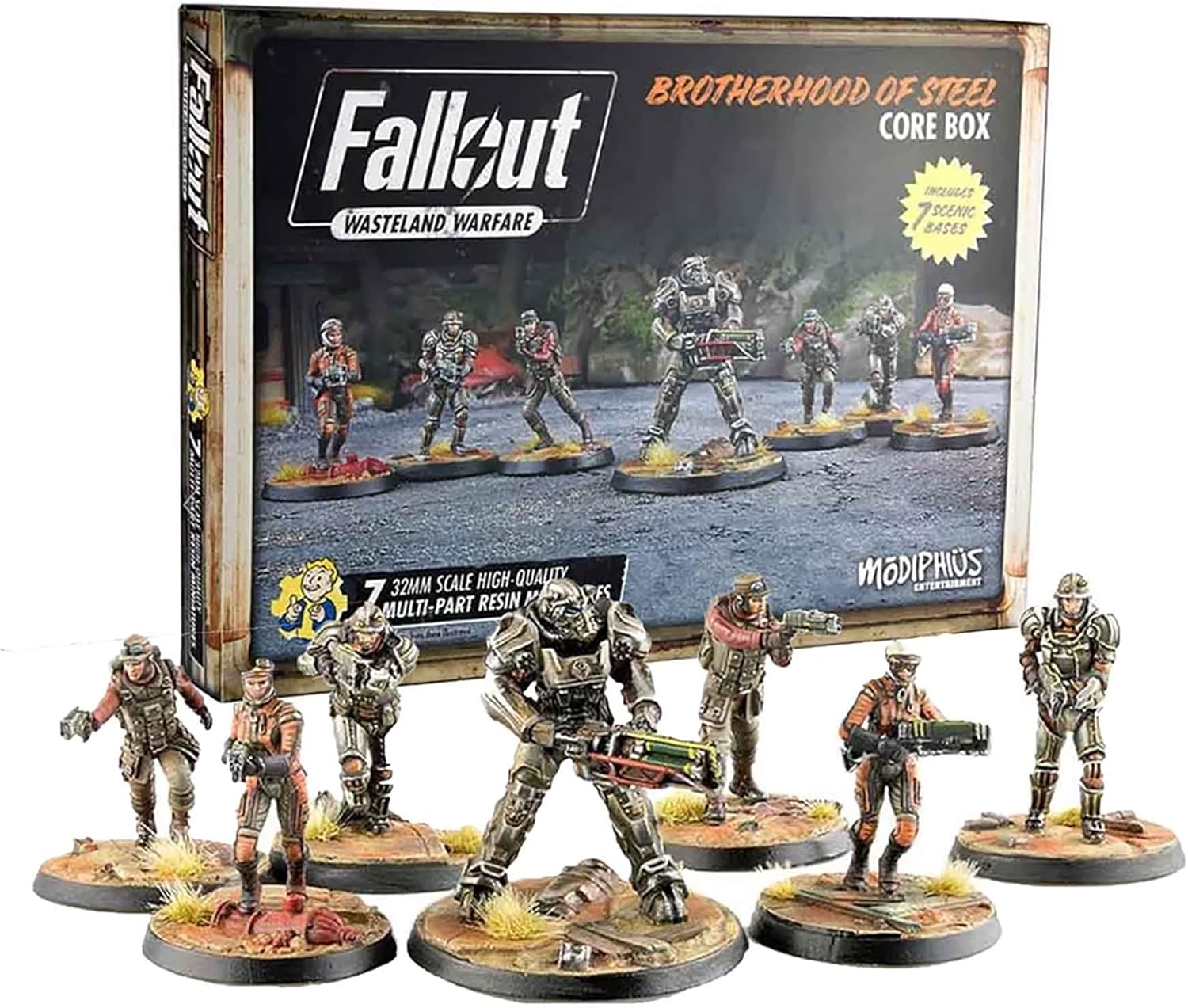 PREMIUM RESIN MINIATURES: Dive into the post-apocalyptic world of Fallout with seven meticulously crafted 32mm scale high-quality multi-part resin miniatures, complete with a scenic bases, offering unparalleled detail and realism for your tabletop adventures.